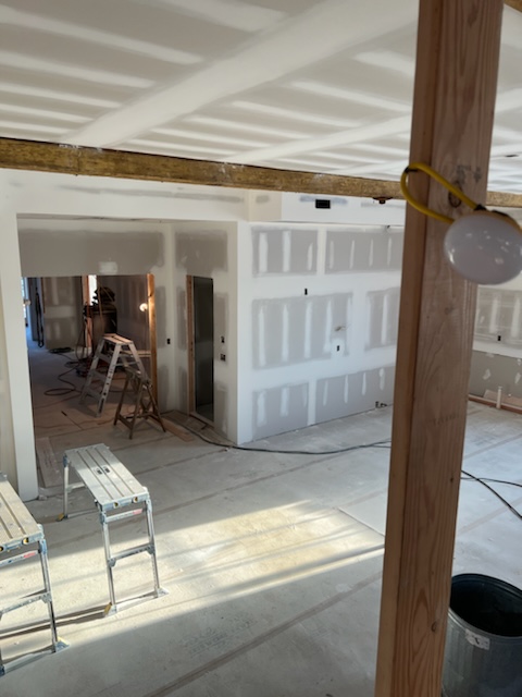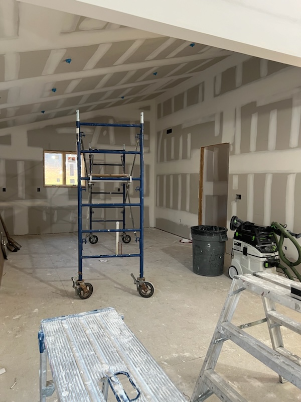As with all our drywall work, sanding is performed using Festool sanding systems with HEPA filtration. This captures dust at the source and helps keep the space cleaner and air safer, while work is being completed.